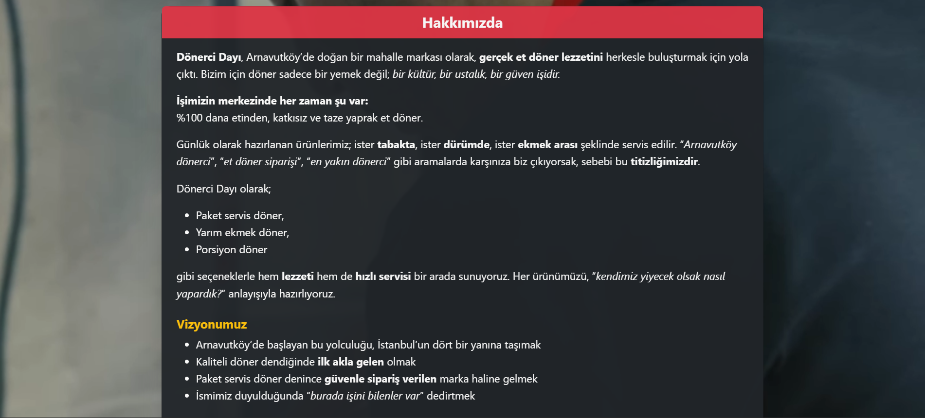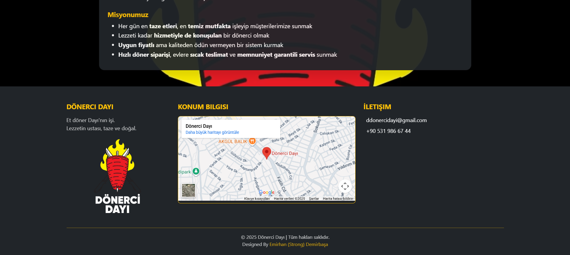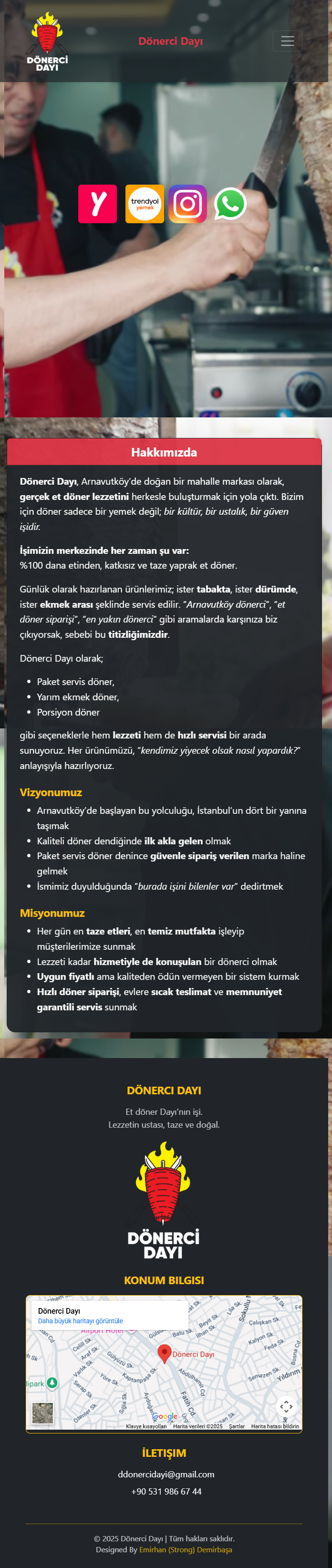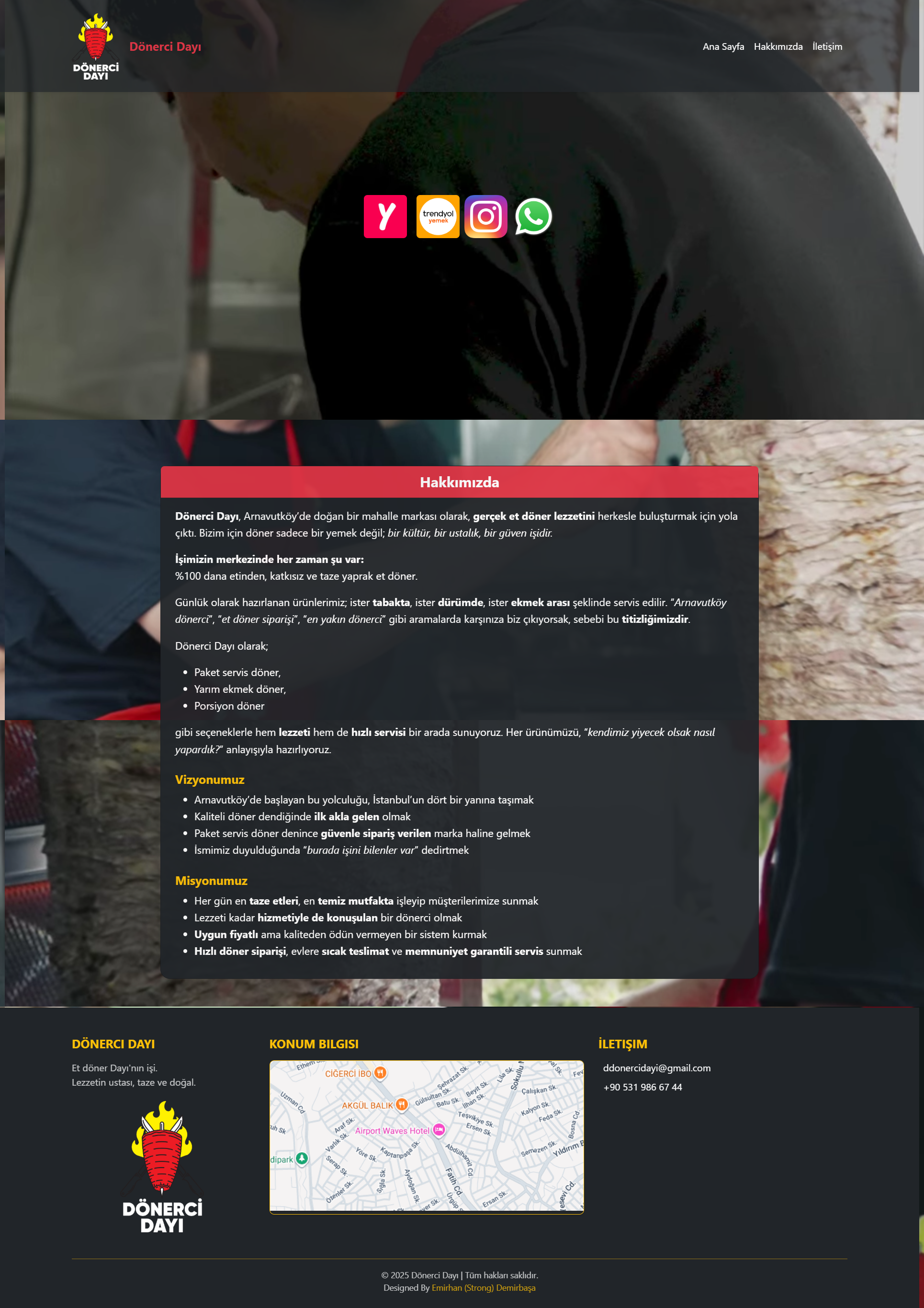 Herkese merhaba, Sizlere yaz aylarında, yaklaşık yarım günlük bir çalışma sonucunda bir restoran için tasarladığım web sitesinden kısaca bahsetmek istiyorum. Restoran benimle iletişime geçerek, müşterilerinin arama motorları üzerinden donercidayi.com adresine girdiklerinde yemek siparişi verebilecekleri uygulamalara kolayca ulaşabilecekleri, aynı zamanda firma hakkında temel bilgileri ve iletişim detaylarını içeren sade bir web sitesi tasarlamamı istedi. Ben de bu doğrultuda, aşağıdaki görsellerde yer alan tasarımı ortaya çıkardım. Ortaya çıkan sonuç, hem işletmenin ihtiyaçlarını karşılayan pratik bir çözüm oldu hem de benim için oldukça keyifli bir deneyim sağladı. Bu proje sayesinde Bootstrap 5 kütüphanesini kullanarak, gerçek bir işletmenin tamamen kendi yazdığım kodlarla bir web sitesine sahip olmasını sağlamanın mutluluğunu yaşadım.